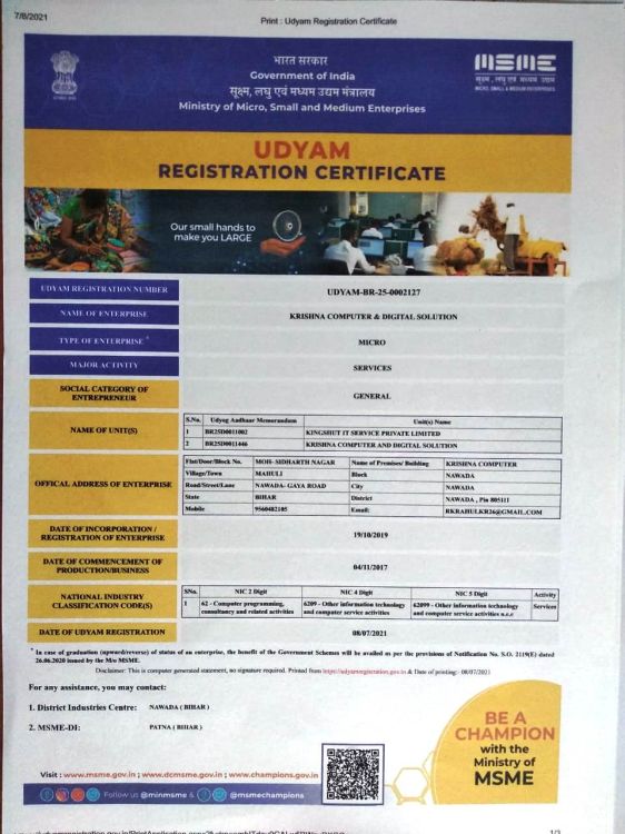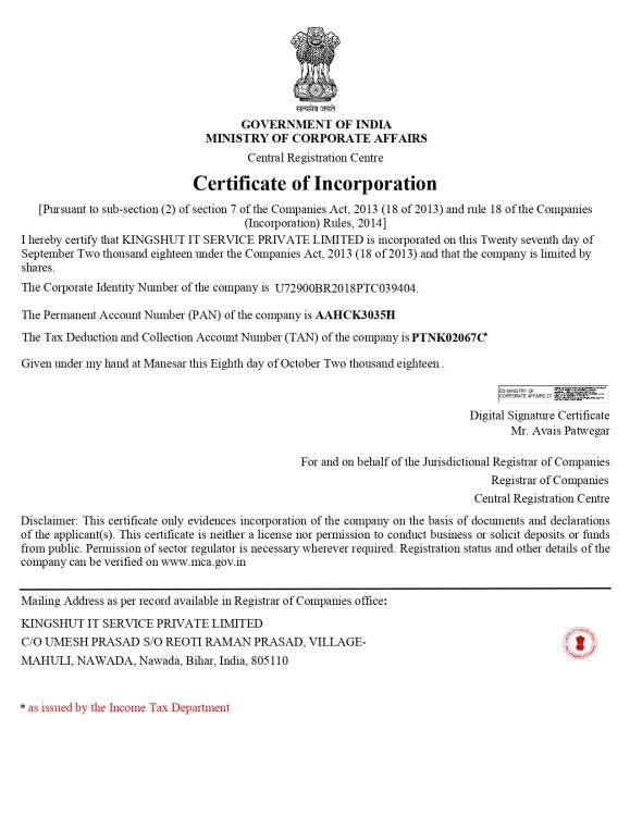 Registered under MCA company "KINGSHUT IT SERVICE PVT LTD.: